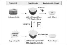 Fehérjéink funkcióját a számtalan térszerkezeti lehetőség közül kizárólag egyetlen natív szerkezet biztosítja, melyet dajkafehérjék ATP-t igénylő "tekerő" működése alakítja ki, mely a szubsztrát molekula ciklikus megragadásából, gombolyításából és elengedéséből áll. A sejtet érő számos károsító tényező a fehérjéket legombolyítja (denaturálja), így azok hajlamossá válnak az összecsapzódásra (aggregációra). A masszív fehérje-aggregátumok végső soron a sejt halálát, ismert betegségeket okozhatnak. Szerencsére dajkafehérjéink (eredeti nevükön stresszfehérjék) funkciót váltanak, a denaturálódó szubsztrátot stabilan, ATP-függetlenül megkötik, és a stresszhatás végéig tárolják. A pályázó többek között vizsgálta, hogy honnan tudja a "tekerő" dajkafehérje, hogy "tároló" stressz-fehérjévé kell változnia, képes-e a stressz elmúltával visszaváltozni, illetve mi javítja meg az elromlott dajkafehérjéket? A kísérletek modelljéül választott 90 kDa molekulatömegű stresszfehérje (Hsp90) ATP-függő tekerő és ATP-független tároló működésre egyaránt képes. A Hsp90-et patkánymájból homogenitásig tisztították, majd megvizsgálták a szerkezeti és működésbeli sajátságait. A kapott eredmények segíthetik a stresszfehérjék működésének jobb megértését és funkciójuk megőrzését, amely lehetőséget nyújthat a károsodott fehérjék felszaporodásával kapcsolatos betegségek (pl. cukorbetegség, öregedés) gyógyítására.