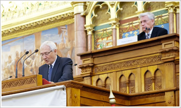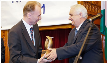 A GDP-hez viszonyított innovációs ráfordítások tekintetében példaként hozta fel miniszter úr Észtország és Csehország példáját, melyek Magyarország jövőjére tanulságot jelenthetnek. Kiemelte, hogy nem az a fontos, hogy mi magyarok mennyire vagyunk innovatívak, mennyire vagyunk tehetségesek. Mindenkit az érdekel Európában és a világban is, hogy a magyar nemzetgazdaság tudja-e hasznosítani ezeket a felfedezéseket, találmányokat, újításokat, szabadalmakat vagy pedig nem. Miniszter úr az alábbi bejelentést tette: "...Éppen ezért had közöljem Önökkel azt a hírt, hogy március 30-ával a hazai Innovációs Nagydíj átadásával összhangban újra meg tudjuk hirdetni az Önök által annyira várt innovációs pályázatokat. Tehát napokon belül ismét megnyílnak a pályázati források az innovációs lehetőségek ösztönzése irányában. Ugyanakkor nem csak pénz teszi az innovációt, hanem a támogató kormányzati magatartás is. Olyan intézményrendszer kiépítése, amely nem akadályként, hanem segítőként élnek meg az innovációban résztvevők..." Zárszavában pedig elmondta: ..."Most nyithatjuk meg az új fejezetet, aminek következtében az innováció az elkövetkező két évben már mindennapos részévé válhat a nemzetgazdasági stratégiáknak, nem csak megfogalmazás, hanem hasznosulás szintjén is. Ahhoz kérem a segítségüket, hogy az elkövetkező két évben minél sikeresebbek legyünk ezen a területen. Ugyanis ez közös érdekünk. A közjó gyarapítására szegődtünk, ki-ki a maga területén. És ezt csak úgy tudjuk megoldani, hogy ha szövetségre lépünk egymással...." Navracsics miniszter előadása után, Szabó Gábor, elnök hozzászólásában kérte, hogy az innováció tekintetében néhány olyan jogszabályt, amelyre a MISZ korábban javaslatokat tett a közbeszerzést illetően, szíveskedjenek elfogadni. Ezáltal egy fillér plusz pénz nélkül könnyebbé lehetne tenni az innovációs szféra képviselőinek életét. Ezek után Higi Gyula, Kassai Róbert, Farkas József, Dési István, Darvas Ferenc tett fel kérdéseket, melyekre miniszter úr helyben reflektált. (Az előadás, illetve a hozzászólások videó anyaga elérhető portálunkon.) A következő napirendi pontnak megfelelően Greiner István, általános elnökhelyettes szóbeli kiegészítést tett a 2011. évi tevékenységről szóló beszámolóhoz. Kitért a Szövetség szakmai érdekérvényesítés területén elért eredményeire. Végszavában pedig elmondta: "...Tavaly egy hozzászólásomban azt mondtam, hogy a 2010-es év, gyakorlatilag elvesztegetett volt az innováció szolgálatából. És azt szeretném mondani így befejezésképp, hogy remélem, hogy a 2011-es év az átmeneti év lesz. S én úgy gondolom, hogy ezt pénteken nyugtázhatjuk, hogy nem egy remény, nem egy kérdőjel, hanem egy kijelentés lesz..." Ezt követően Csapody Miklós, a Felügyelő Bizottság tagja tett szóbeli kiegészítést: a Bizottság átnézve a gazdálkodást és a tevékenységet az Alapszabállyal összhangban megfelelőnek találta a Szövetség munkáját. Kiemelkedőnek találta az FB a fiatal tehetségeknek a felkarolását, a tehetséggondozást. Sokra értékelte továbbá a Titkárság munkáját, amely nagyon szűkös emberi erőforrásokra való tekintettel maximálisan látta el a feladatát. A közgyűlés ezek után egyhangúlag elfogadta a 2011. évi beszámolót és a Felügyelő Bizottság jelentését. Továbbá egyhangúlag szavazott arról is, hogy maradjon a 2011. évben elfogadott tagdíjrendszer. A közgyűlést fogadás zárta a Hotel Ramada Plaza Éttermében. Jubileumi, XX. Magyar Innovációs Nagydíj ünnepélyes átadása 2012. március 30-án, az Országházban adták át a 2011. évi innovációs díjakat. A Himnusz elhangzása után Dr. Pakucs János, a Magyar Innovációs Szövetség tiszteletbeli elnöke nyitotta meg az ünnepséget. Prof. Závodszky Péter, a Magyar Innovációs Alapítvány elnöke köszöntőjében többek között elmondta: "...nem kishitűséget, inkább reményt igyekszem kelteni. Pénzünk - tudjuk - nem sok van, de eszünk használatában csak magunk korlátozhatjuk önmagunkat... ... akkor érhetünk el látványos sikert, ha: az innováció szelleme átszövi az egész társadalmat. Magyarországon egy potenciálisan jól működő innovációs rendszer legtöbb eleme - ilyen-olyan fokon - létezik, de hiányzik ezek összehangolása egy működő rendszerré. Ez lenne az ország tudományos, technológiai és innovációs politikája, amely egyrészt önálló, jól meghatározott cél és eszközrendszer felvázolásával megfogalmazott stratégiai program, másrészt pedig alapvető társadalom- és gazdaságpolitikai koncepció, amely szerencsés esetben áthatja a tervezés és cselekvés minden elemét. ... A Magyar Innovációs Alapítvány és a Magyar Innovációs Szövetség azért hozta létre az Innovációs Nagydíj intézményét, hogy példával szolgáljon a magyar társadalomnak: lehet ebben a közegben, különleges szellemi teljesítménnyel, versenyképes és extraprofitot hozó gazdasági teljesítményt elérni. Az elmúlt húsz évben számos példáját mutattuk be ennek, s tesszük ezt ez alkalommal is. A számos jó példa mutatja a lehetőséget, a példák számának elégtelen volta pedig mutatja a lemaradást, az elszalasztott esélyt a felzárkózásra... ... Az Innovációs Nagydíj átadása ünnep, ünnepeljük az alkotókat, azokat, akik megmutatják milyen úton lehet és kell járnunk. Tartozunk neki és magunknak annyival, hogy megszívleljük intéseiket és követjük a példájukat. Azt várom magunktól és a magyar tudományos és műszaki értelmiség egészétől, hogy erre állhatatosan és világosan felhívja a figyelmet, és azt várom a döntéshozóktól, hogy meghallgatják a felelős és értő hangoka
